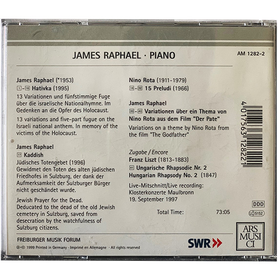 13 variations and Grand 5 voice fugue on the Hatikva meaning hope which is the National Anthem of Israel dedicated to the victims of the Holocaust which included my grandmother Julia Nachmias , my uncle Victor and my aunt Beatrice who were both young children at the time and were taken from Salonica , Greece to Auschwitz where they were killed along with their mother by the Nazis . The sheet music of this piano composition by James Moussaieff Raphael which is a world renowned masterpiece will be personally signed by the composer.